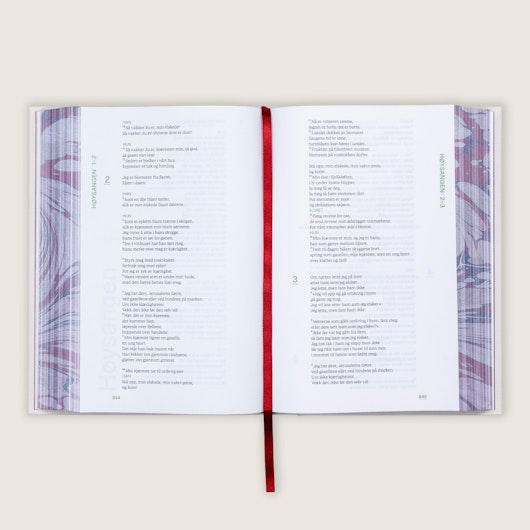 Ein moderne bibelutgåve i heilt nytt og lesevenleg design. Storleik: 14,5 x 21,4 cm. Teksten er i ein spalte og har ikkje dei vanlege fotnotane. Overskrifter, tall og tittelsider er i grønt. Dei første sidene har kunst av Thorolf Holmboe og sider der brudeparet kan skrive si eiga historie. Ordforklaringar og kartdel inngår. Brudeparbibelen er bunden inn med lys beige tekstil, har marmorering i raudt langsmed kantane og leseband.